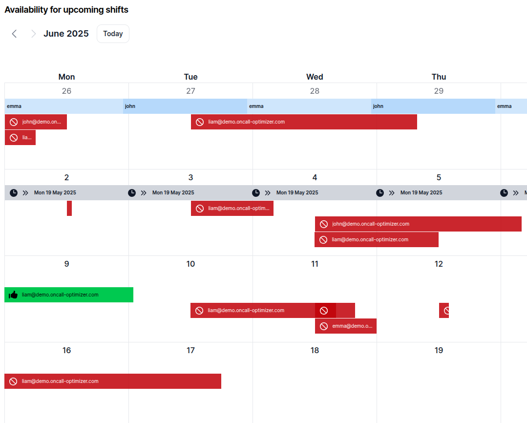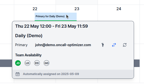 The color-coding system makes it easy to identify which team member is assigned to each shift. Blue tones indicate primary on-call roles, while purple tones represent secondary roles (when applicable). This visual differentiation helps you quickly assess coverage patterns across your team.