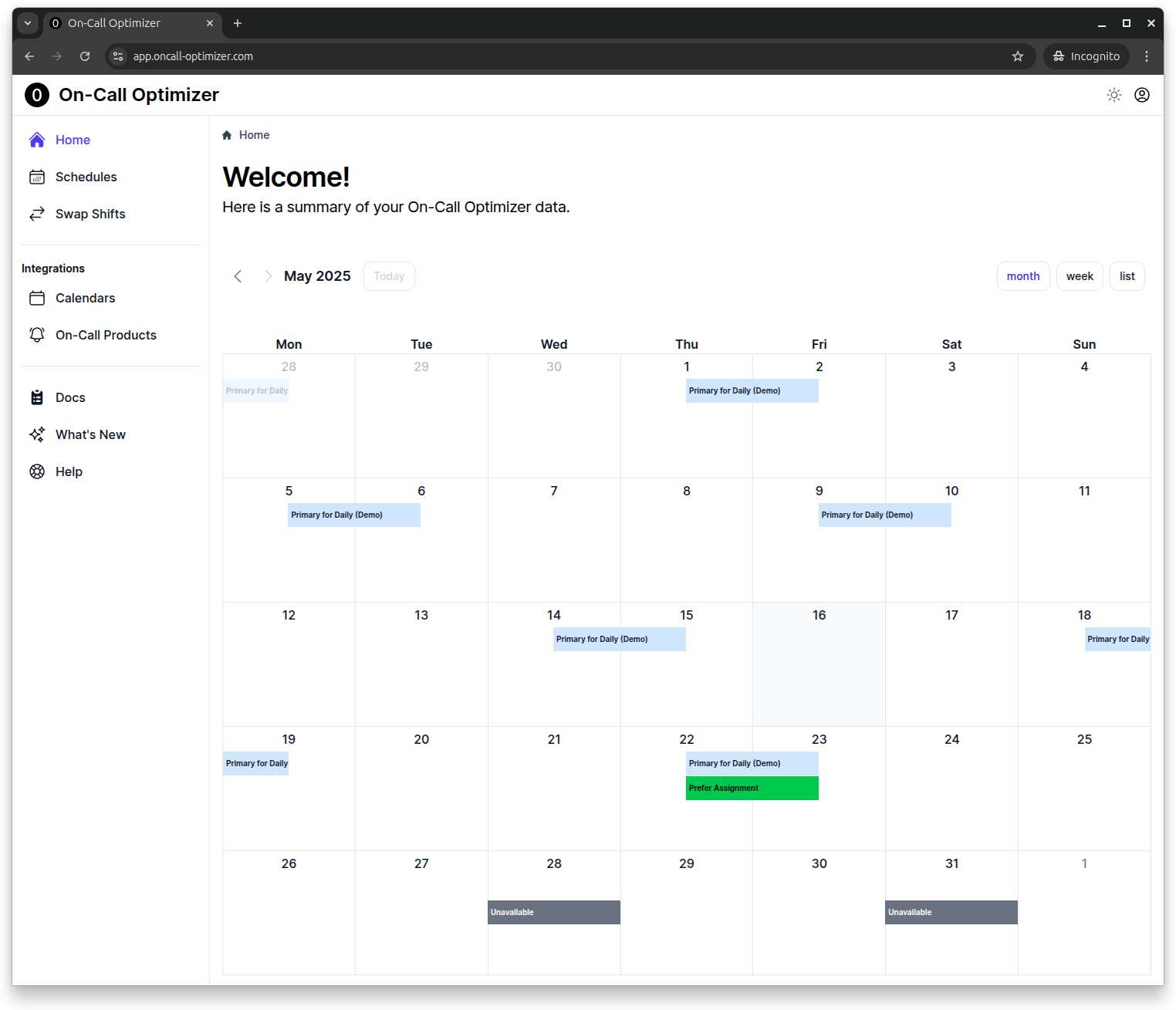 The new home page presents your first interaction with the calendar interface in On-Call Optimizer.