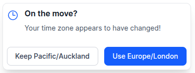 - If the detected time zone changes from what was originally observed when your account was created, a pop-up will now prompt you to confirm whether you want to update the stored value (e.g. if you have permanently moved country) or ignore the change (e.g. during a short trip).