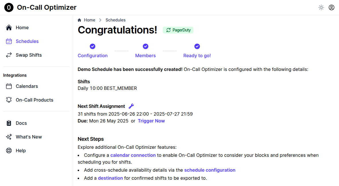If the listed shifts do not match your desired configuration you can alter them now (e.g. to add a secondary assignee). Refer to the schedule configuration docs for further information.